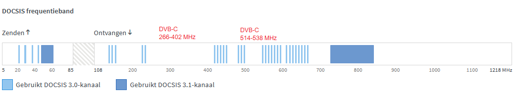 - de totale upstream gedeelde bandbreedte op de coax is dus: 120 Mbit/s (4 x 30 D3.0) + 90 Mbit/s (D3.1) = ca 210 Mbit/s (D 3.1 = 6 - 6.5 bit/Hz).