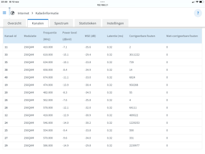 Als ik jouw waarden vergelijk met deze hier (zie screenshot onder), dan valt mij op dat de signaalsterkte (Power level) bij jou een stuk lager ligt (gemiddeld -11 dB) dan bij mij (gemiddeld +3 dB)