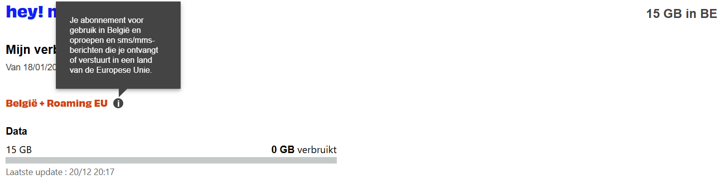 Geen paniek. Hey staat er om bekend om alles eigenlijk fout op hun site te zetten. Op de Franstalige site staat het wel juist, en in de app heb ik wel degelijk een metertje 25GB BE+EU.michaelbelgium schreef: 17 dec 2024, 09:03 Dus 5€ + 0.01€/MB buiten BE + bellen buiten BE ook extra.. of alleen de data