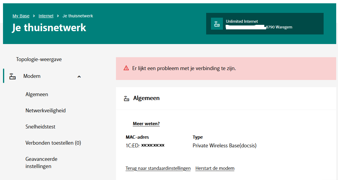 - thuisnetwerk is leeg (foutmelding gezien de BASE modem afgeschakeld is van de coax (en ook stroomloos).
