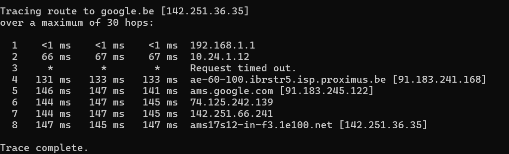 Daarnet opnieuw tracert en nu is alles wel weer normaal. Go figure. Probleem in de proximus kast?