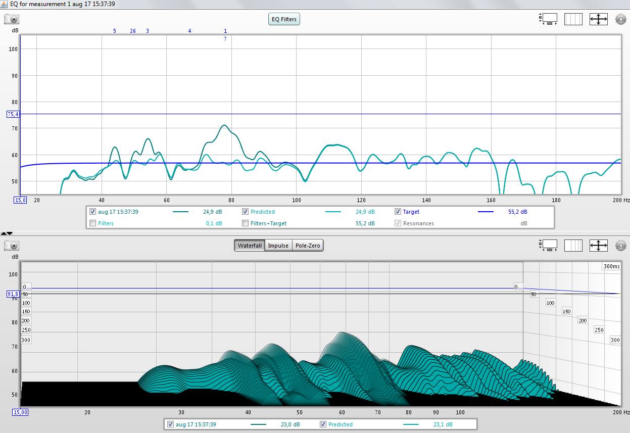 Hier een voorbeeld van hoe het wel hoort, 8 parametrische equi parameters berekend, en de curve is bijna plat (predicted lijn) ... ik corrigeerde bij deze klant alles tot rond de 100 Hz, is het meest storend gebied als er bepaalde frequenties eruit springen, dan gaat het laag boomen.