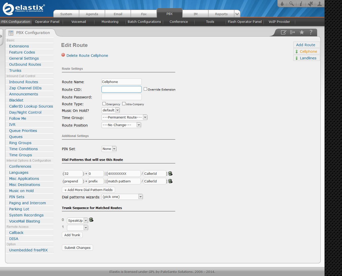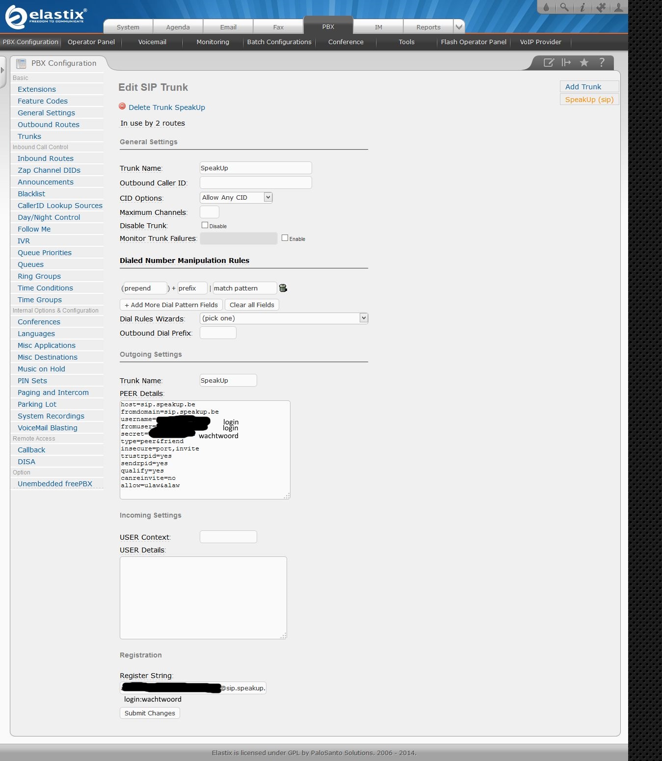 Daar ik vermoed dat er hier nog wel klanten zijn van SpeakUp die werken met een PBX als Elastix (gebruik ikzelf), FreePBX, Asterisk, ... vroeg ik mij af of jullie even kunnen controleren of de gegevens hieronder correct zijn (vermoedelijk zit de fout in de dial patterns/Outbound routes), wetende dat: