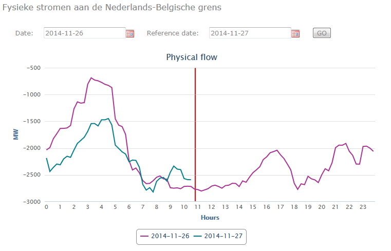 • vandaag piekte de fysieke stromen aan de Nederlands-Belgische grens op 2818 MW import (zie grafiek hieronder);