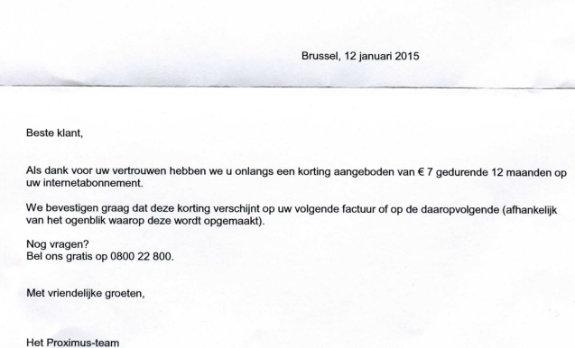Dit jaar 2015 kregen we als trouwe klant een maandelijkse vaste korting van 7€, graag had ik vernomen of we als trouwe klant opnieuw in 2016 beloond worden met een zelfde korting; (zie factuur Uw trouw beloond: Internet ) We zouden het jammer vinden indien we volgend jaar deze korting niet meer zouden krijgen en een feitelijke prijsverhoging moeten meemaken.