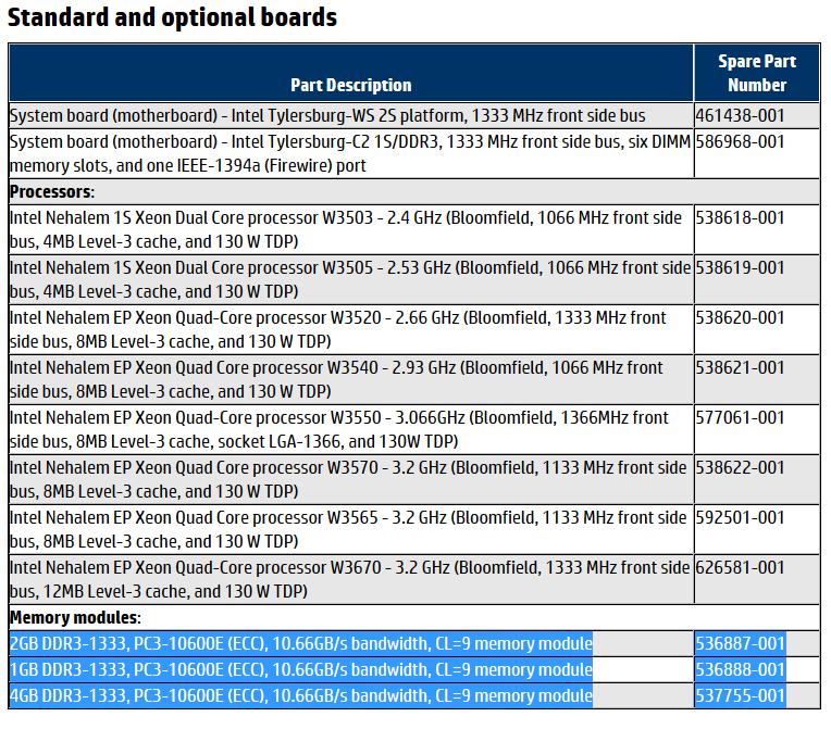 - 536887-001: 2GB DDR3-1333, PC3-10600E (ECC), 10.66GB/s bandwidth, CL=9 memory module