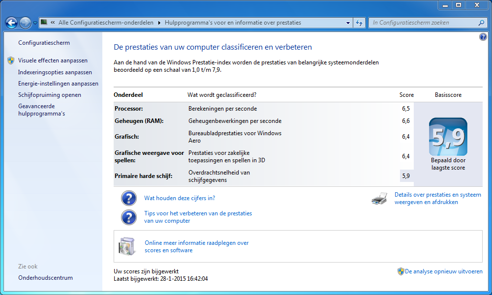 Hier in bijlage nog een screenshot van de prestatie index van windows: