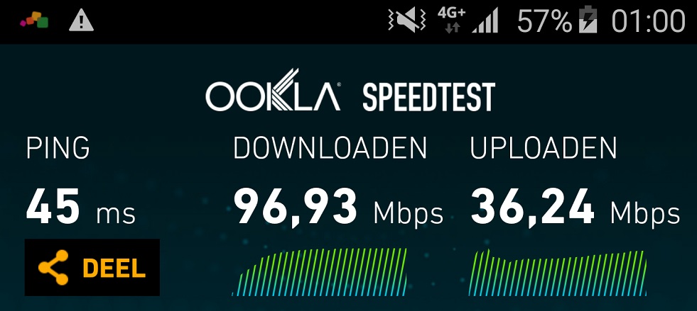bjornvw schreef:Net even een speedtest gedaan met 4G+ met Samsung Galaxy S6 in het grensgebied Mechelen/Sint-Katelijne-Waver/Bonheiden 97,60Mbps down - 33,50 up (buitenshuis met een ontvangst van 3/4). Binnenshuis was de ontvangst 2/4 en het resultaat met 4G+ was 45,40 down en 11,14 up.