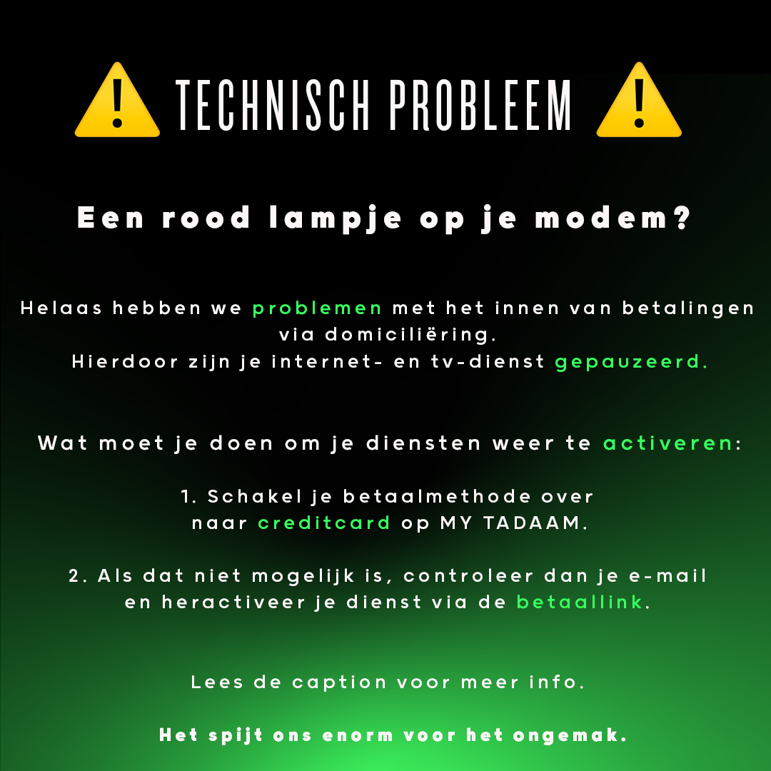 Het probleem wordt veroorzaakt door blokkades van verschillende banken richting onze betalingsprovider. Het treft verschillende bedrijven, niet alleen TADAAM.