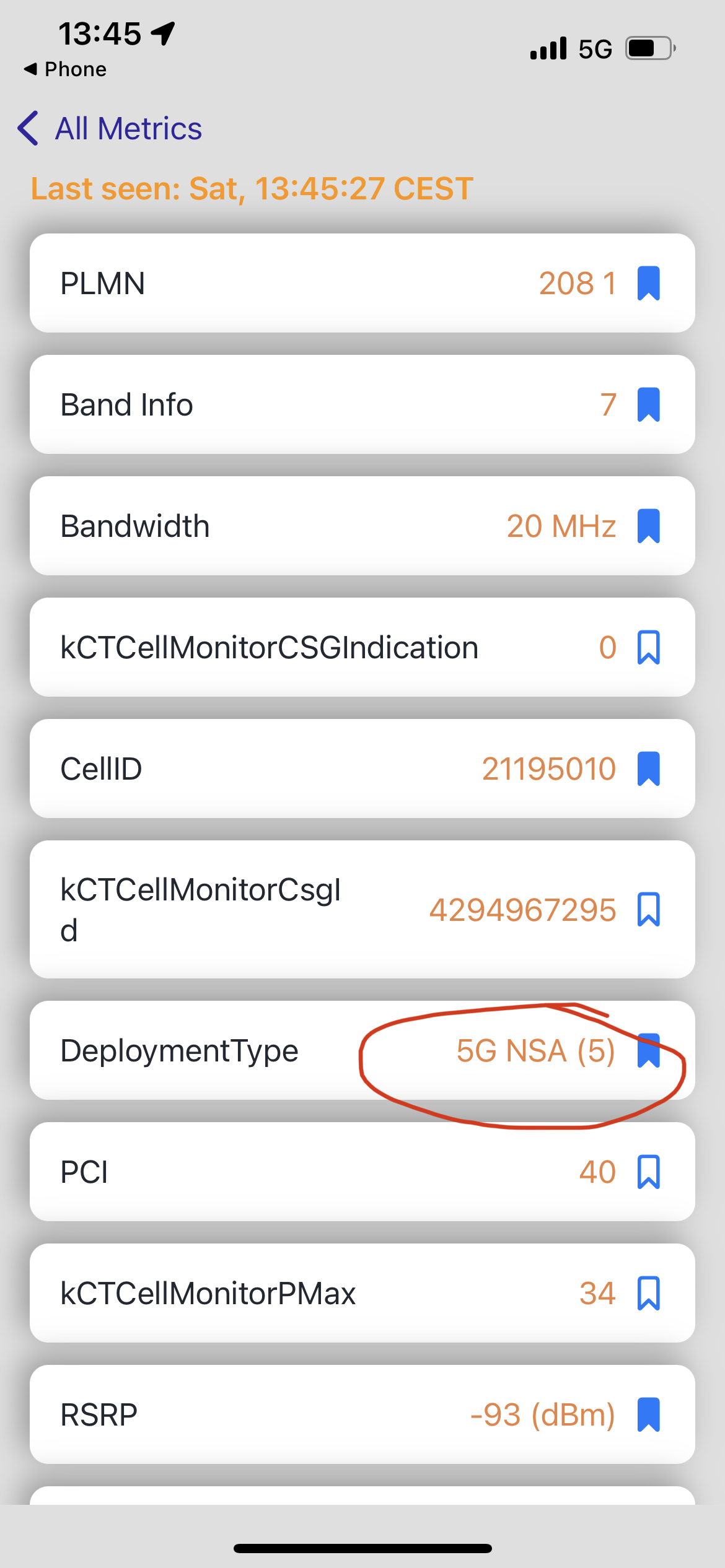 Terug in Frankrijk. We weten dat MV 5G nog niet ondersteund (binnenkort wel, maar wanneer is niet gekend), maar als ik de details van het netwerk bekijk is het alsof ik op een 5G zit maar dan met 4G functionaliteiten… of hoe kan ik het interpreteren? NSA staat voor non stand alone: 5G NSA is a solution for 5G networks where the network is supported by the existing 4G infrastructure.