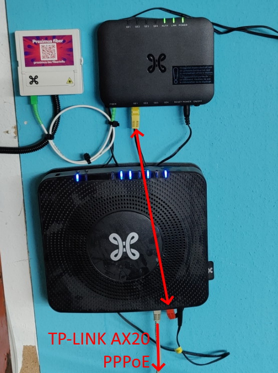 Op één LAN poort van de BBox hangt een TP-LINK AX20 WiFi 6 router die via PPPoE een verbinding maakt doorheen de BBox.