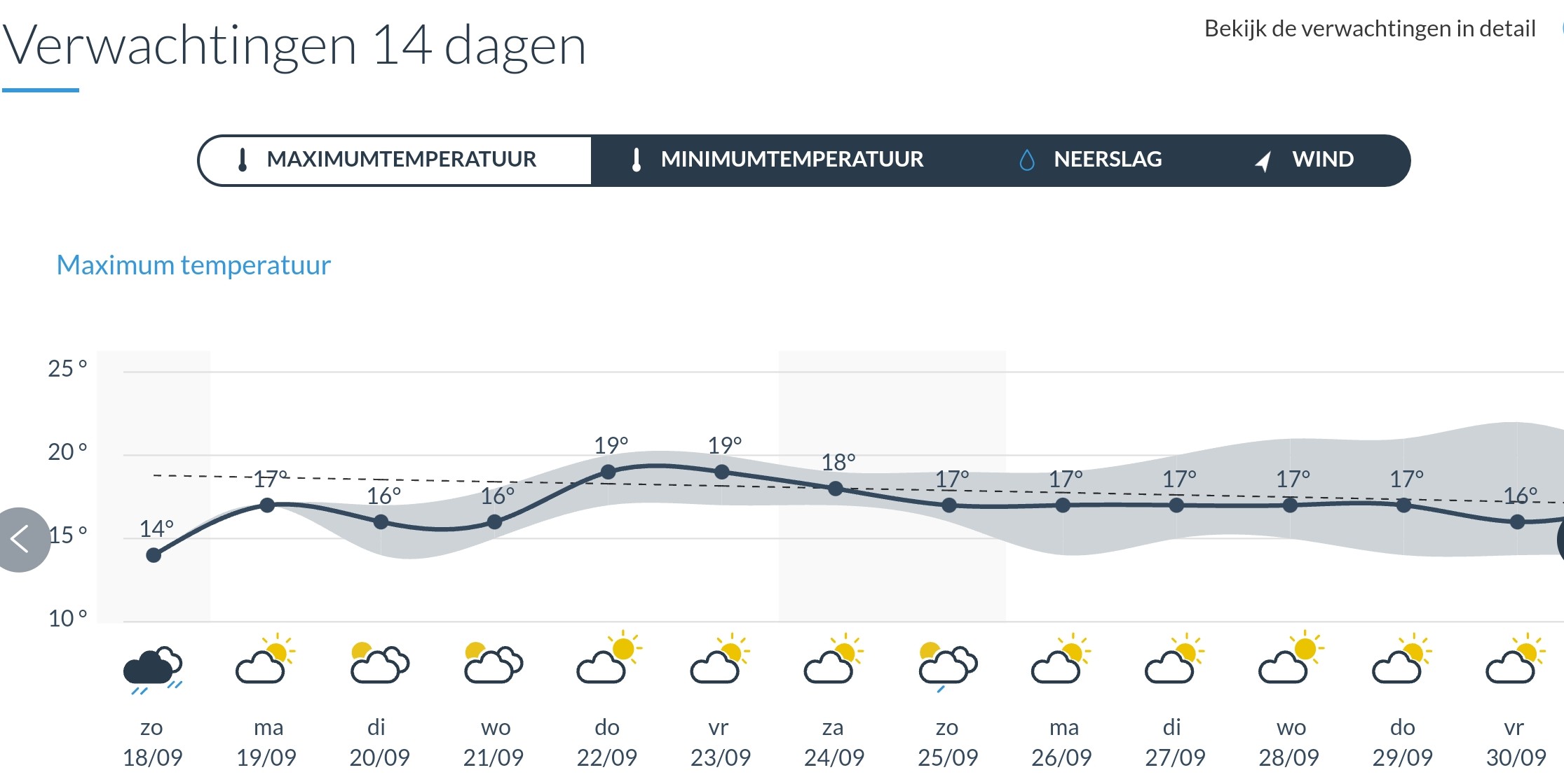 Je bedoelt dat de temperaturen terug richting waardes gaan die normaal zijn voor de tijd van het jaar (vandaag zitten we daar 5 graden onder). Des te beter, elke graad meer is een besparing van €€€.ivob schreef: 17 sep 2022, 16:08Volgende week zitten de buitentemperaturen trouwens weer in een stijgende lijn.