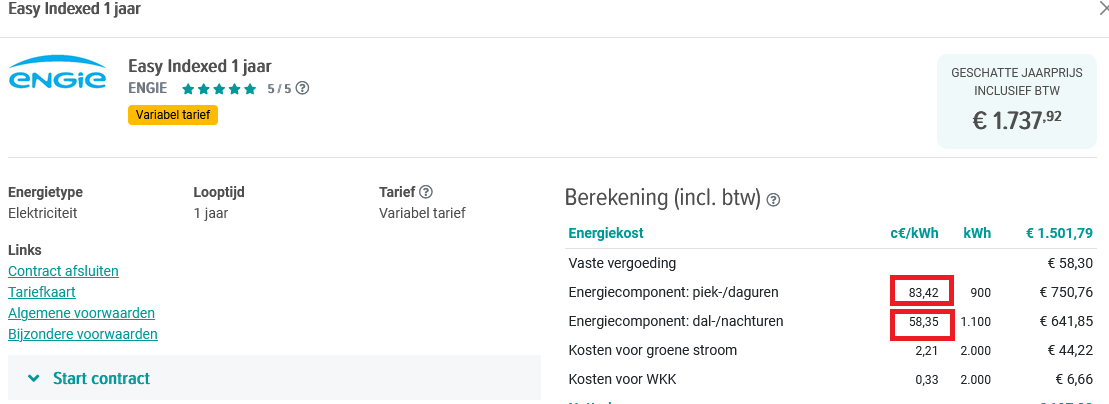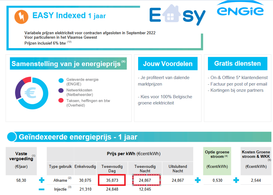 Kan mij iemand het grote verschil uitleggen tussende KWh prijzen die ik tergvind op de engie website (https://www.engie.be/nl/energie/elektri ... oorwaarden), en de V-test berekening?