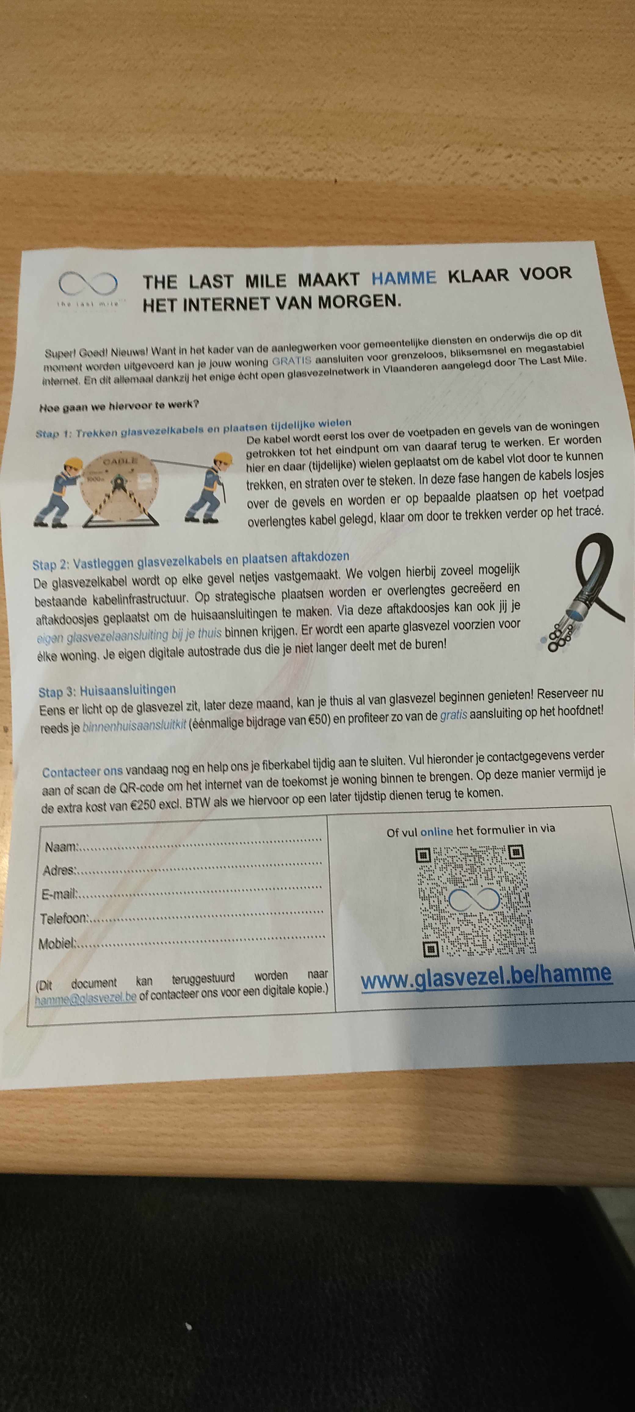 Ja,ik woon in Hamme. Ondertussen nog niet veel zien bewegen. De kabel ligt nog los op het voetpad, soms op straat, tot ik die weer tegen de muren leg. Recht over de Verbindingstraat ,aan het café ligt er een hoop opgerolde kabel die bijna het hele voetpad in neemt en waar je in het donker goed moet kijken om er niet over te vallen. Op de gevels hangt alles los en tussen de regenpijpen gestoken. Ook nog geen antwoord gekregen op de vraag wie de 60 aanbieders zijn waar ze het over hebben op de website. Geeft niet echt veel vertrouwen. Ik blijf voorlopig maar bij vdsl denk ik .