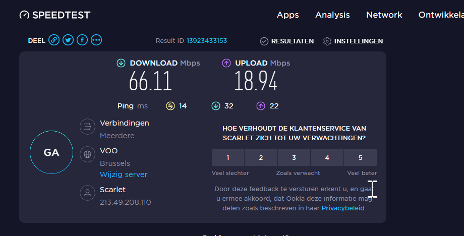 50/4 begint me beetje te weinig te worden, ik had gehoopt op een structurele aanpassing naar bvb 100/20. Indien dat er niet komt, zoek ik mijn toevlucht elders. Hoge snelheden heb ik niet nodig, maar 100mbits lijkt me toch tegenwooridg het minimum (voor mijn werk moet ik soms bepaalde ISO bestanden downloaden, vroeger deed ik dat bij klanten, maar steeds meer home office). Een ISO is toch makkelijk 4 à 5 gigabytes groot.