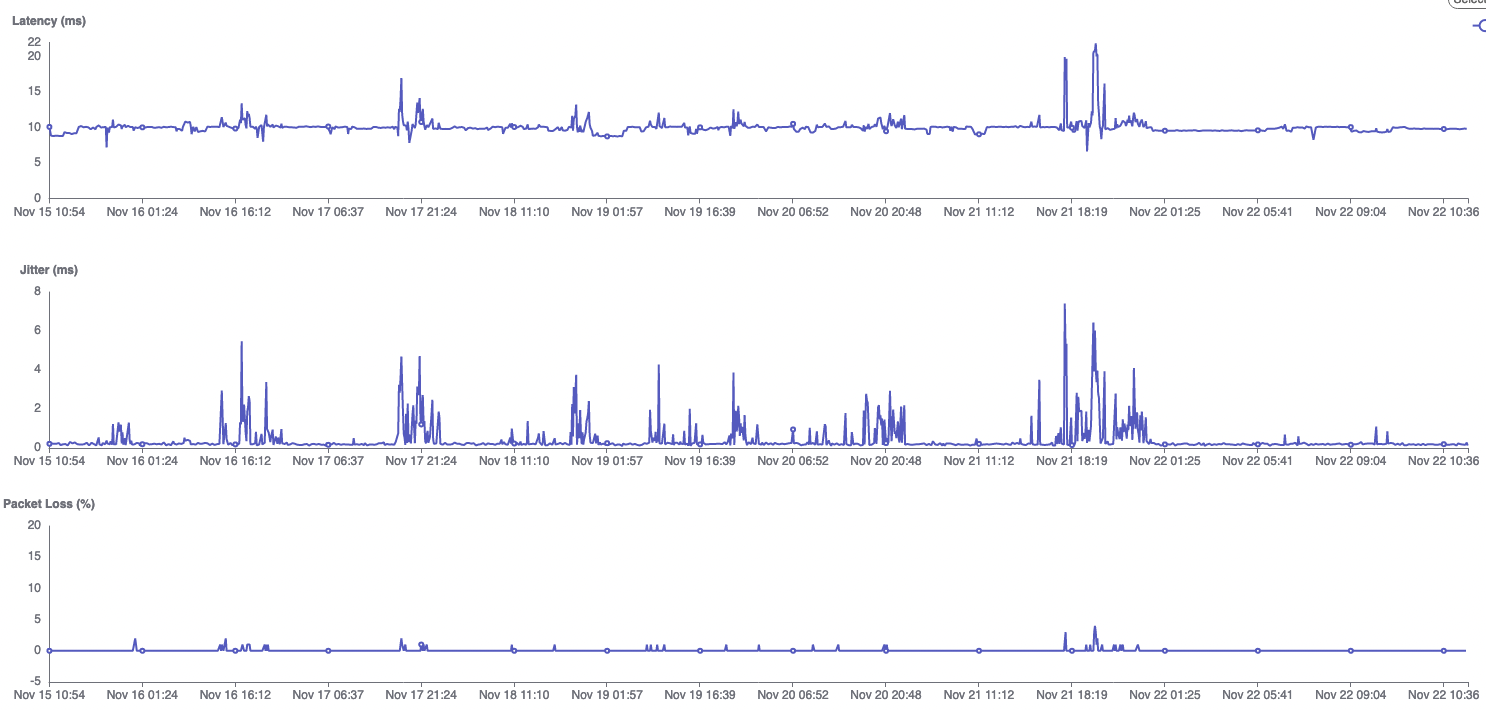 Hier de laatste week qua latency/jitter/packet loss richting cloudflare dns: