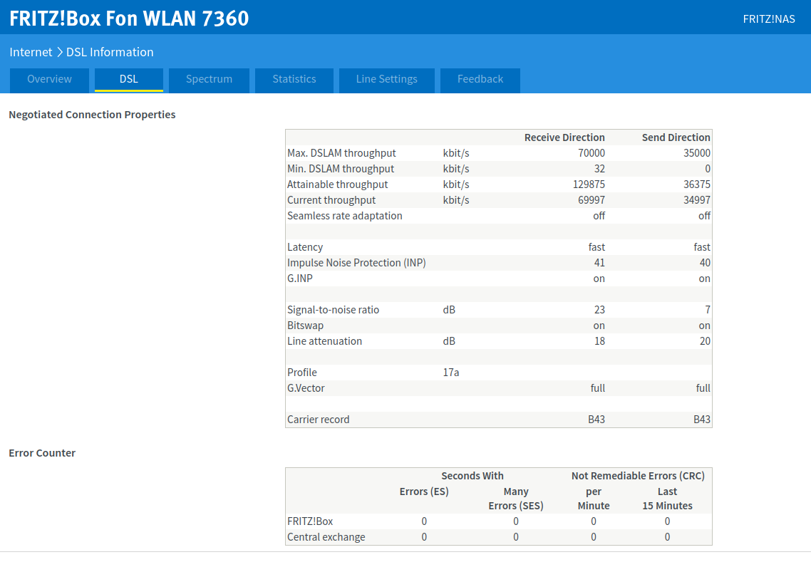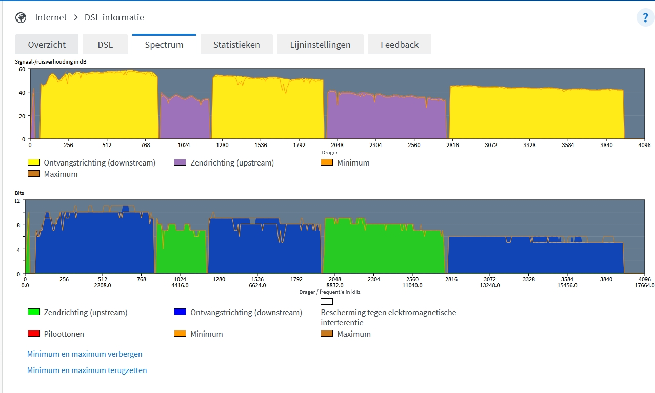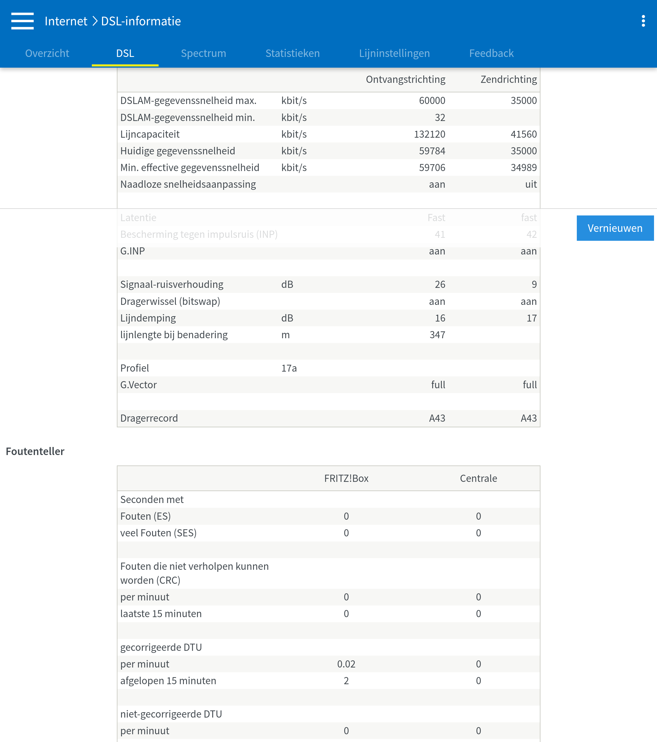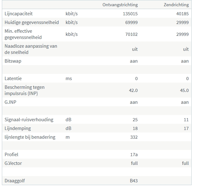 - gisteren de modem herstart en ging de lijn van 70/6 naar 70/15 met nog steeds uitstekende waarden (0 errors en DTU's, SNR 24/21, lijncapaciteit 130/40)
