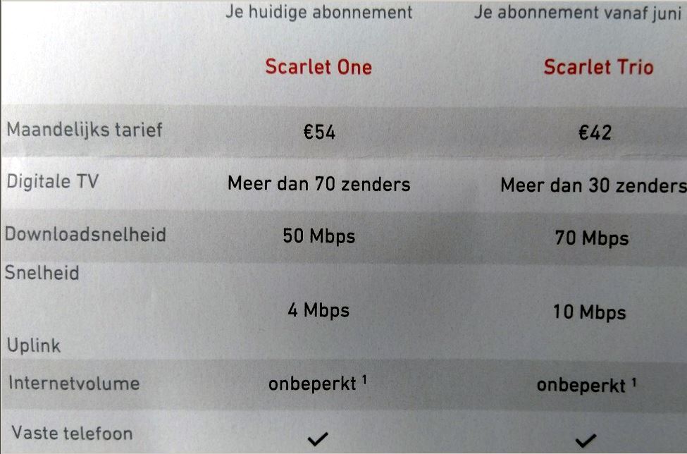 Heb ook die brief gekregen,ik vind het geen verbetering (One gaf altijd de grootst mogelijke snelheid)maar het staat anders op die brief. Het is wel een fin. goede zaak, maar niet voor Scarlet of Proximus daarom verbaasd dat het zover komt, in Juni is het gedaan met Scarlet One.