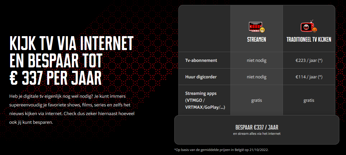 Bwoh, met dat ze reclame maken voor TV streaming zie ik ze net wel afkomen met een streamingaanbod in optie voor wie sporadisch nog eens TV kijkt en graag eens iets opneemt.