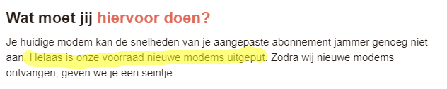 (Ze hebben nog zo'n oude zwarte DOCSIS 3.0 HGW, exacte type weet ik niet)Je modem zal de snelheden van je aangepaste abonnement jammer genoeg niet aankunnen. Gelukkig kan je nu al een nieuwe aanvragen zo surf je vanaf 24 april 2023 zorgeloos verder! En geen zorgen, hiervoor rekenen we geen extra kosten aan.