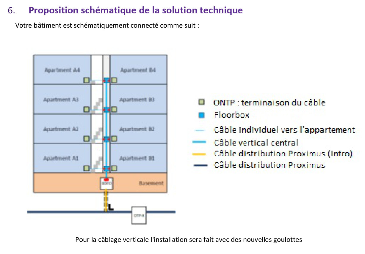 Dit plan staat in het document dat de syndicus heeft toegestuurd gekregen. Klopt mijn vermoeden dat Proximus eerst, zonder in ook maar één appartement binnen te komen, het netwerk installeert tot aan de "Floorbox", en dat ik daarna, op een andere dag via EDPnet fiber kan bestellen?