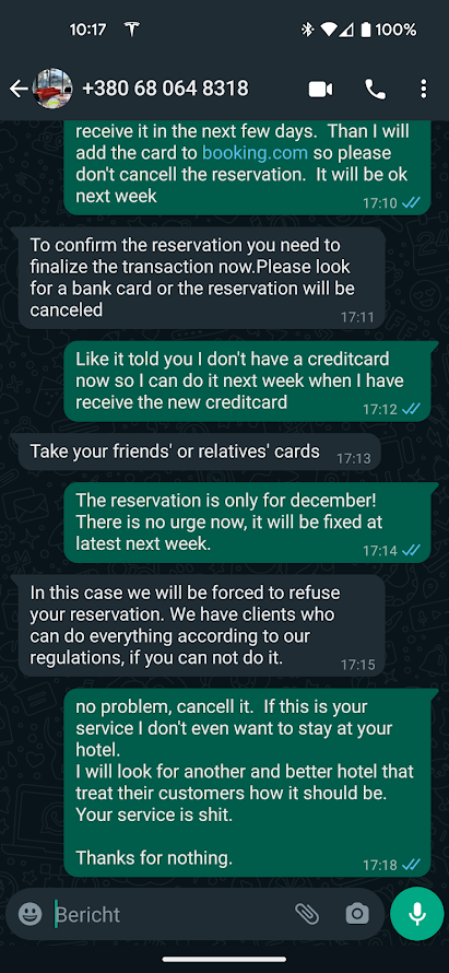 1 dag later krijg ik bericht via whatsapp van het hotel dat we gereserveerd hebben een maand geleden voor 4 dagen verblijf in december, deze reservatie was gemaakt via booking.com