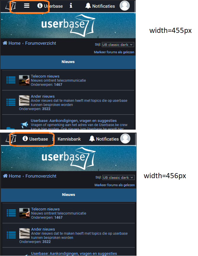 Sinds mijn nieuwe smartphone heb ik een probleempje ontdekt bij het bezoeken van deze site. Ik merkte dat het menu icoon verdwenen was. Ondertussen heb ik wat geexperimenteerd met de developer settings: het is duidelijk te zien dat bij 455px breedte alles ok is, maar vanaf 456px verdwijnt het icoontje (zie screenshot hieronder).