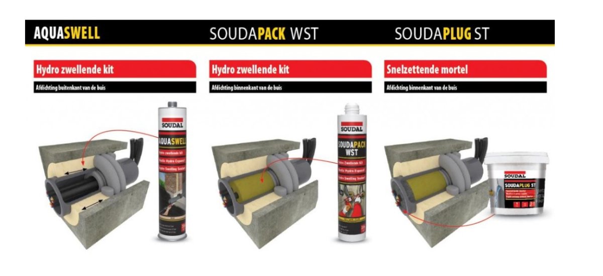 Ik had eerst een 5tal cm waterdichte snelcement van Mapei erin geduwd en daarop een 5tal de soudal. Soudal heeft wel twee versies van die tubes, 1 voor rond de buis en 1 voor in een buis. Misschien beter de andere gebruiken.