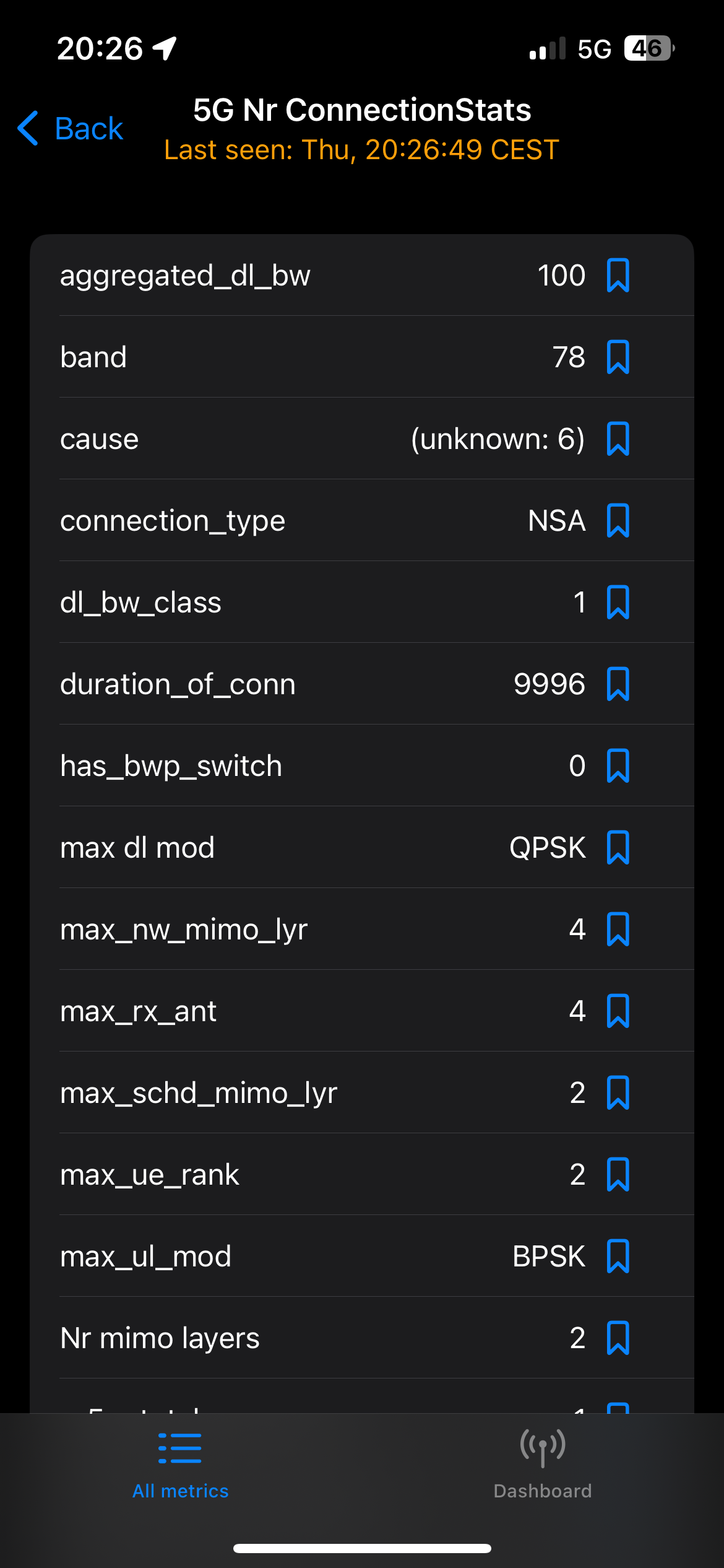 Dit kan je bevestigen door onder NR ConnectionStats te kijken, waar je best altijd kijkt voor informatie over je 5G-verbinding. Zo wordt duidelijk (je moet altijd de timestamp bovenaan goed in het oog houden) dat ik momenteel dus helemaal geen 5G-verbinding heb, ondanks dat het wel in de statusbar staat. Enkele minuten daarvoor heeft mijn toestel dus wel beslist even de beschikbare band 78 te gebruiken.