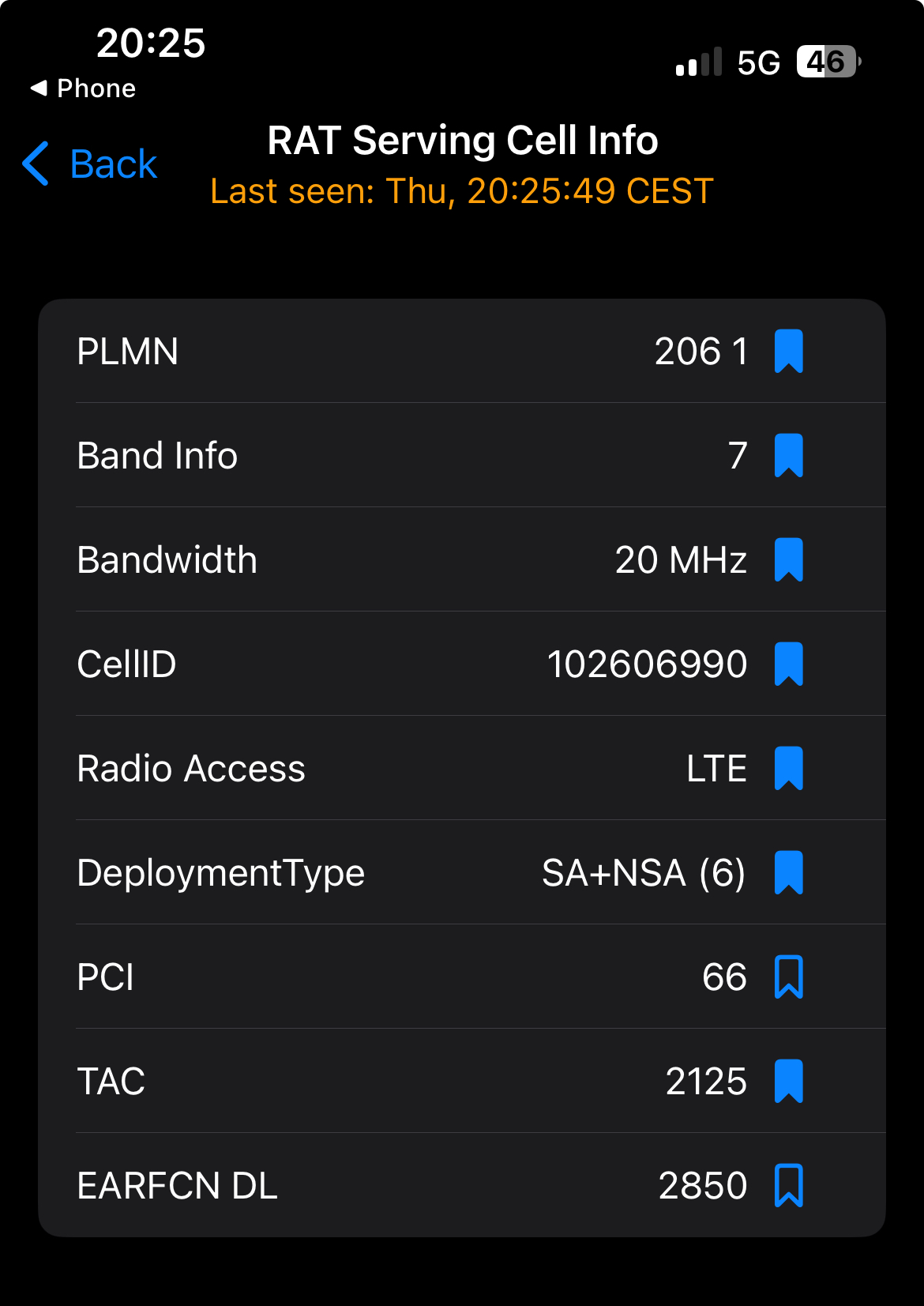 Van wat mij verteld is, vertelt de Serving Cell Info niet per sé iets over welke van de beschikbare technologieën je gebruikt. In geval van 5G SA betekent 'Radio Access = LTE' dat op de weergeven band (bv. 7 in bovenstaande screenshot) kan worden teruggevallen.