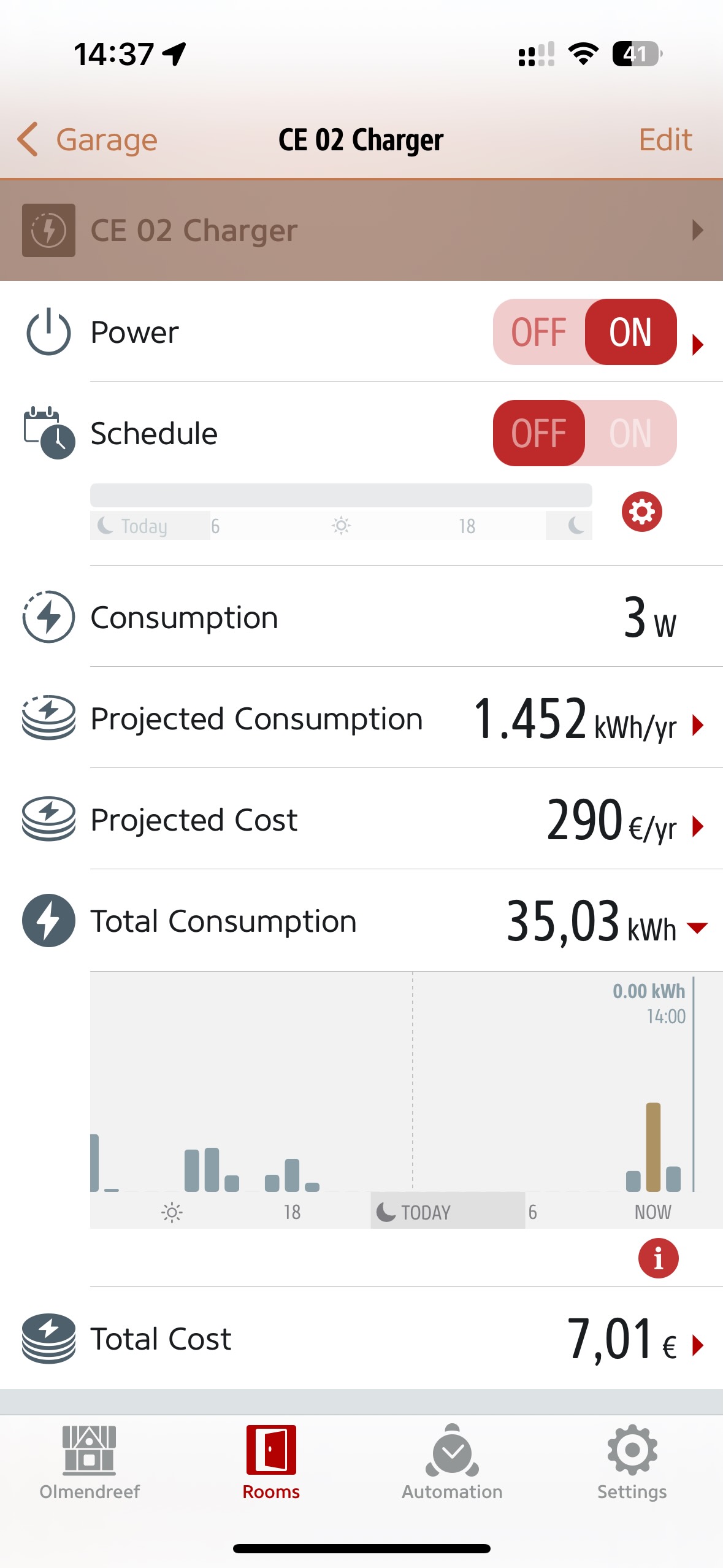 Tussen zijn lader en het stopcontact heb ik een Eve Energy gestoken, en heb daar dus nu al 7,5 weken "stats" van. Daarin staat dat als ik hem blijf gebruiken zoals in de afgelopen 7,5 weken dat me dat in het totaal dan €300 per jaar zal kosten.