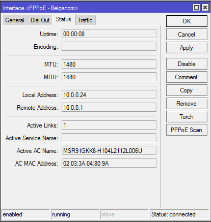 PS : ik vreesde al even dat één van mijn eigen routers reageerde op de PPPoE handshake (configuratie van testjes) maar bij Active AC Name staat weldegelijk MSR91GKK6-H104L2112L006U (dus 91GKK : Gent Keizer Karel)...