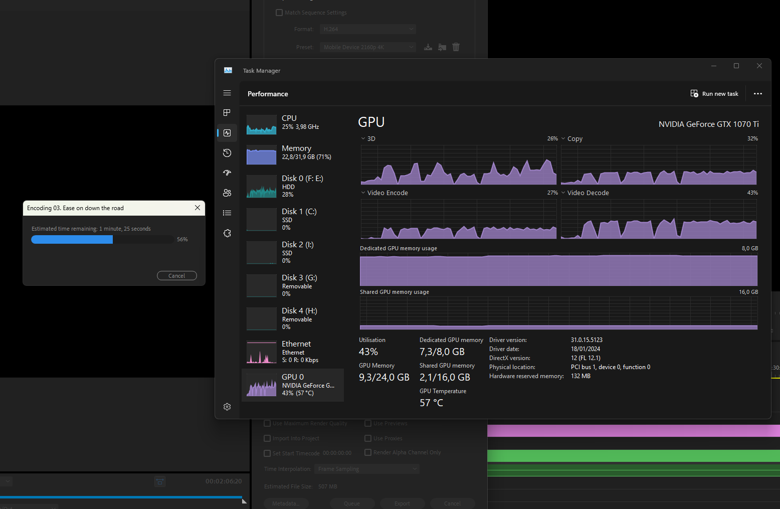 Mijn 1070 Ti wordt maar zo'n 43% belast bij een 4K-export. Onderschat ook niet hoeveel CPU audio-exports kosten in het begin van het export-proces, da's puur CPU, net zoals het renderen van AfterFX comps. 2024-02-18_19-32-30.png