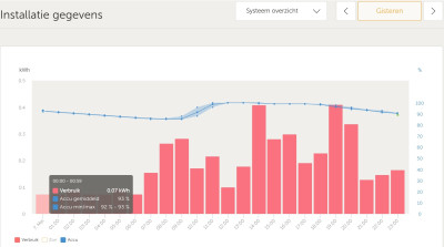 Hier bedraagt het continu verbruik 's nachts een 50 tot 100 W en door de dag 100 tot 200 W (en een full electric woning met een binnen- en buitenkeuken, twee koel/vriescombinaties die 24/7 draaien, 6/7 thuiswerk, enz).