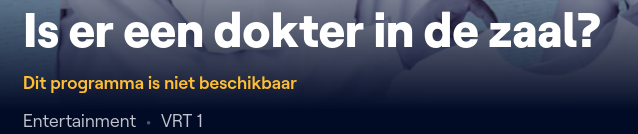 Nog zoiets, er was gisteren avond live/lineair het programma "Is er een dokter in de zaal?" bezig op VRT 1, wil ik op VRTMAX kijken naar de vorige afleveringen en hop "Dit programma is niet beschikbaar" ... begint wel dik tegen te vallen hoor.